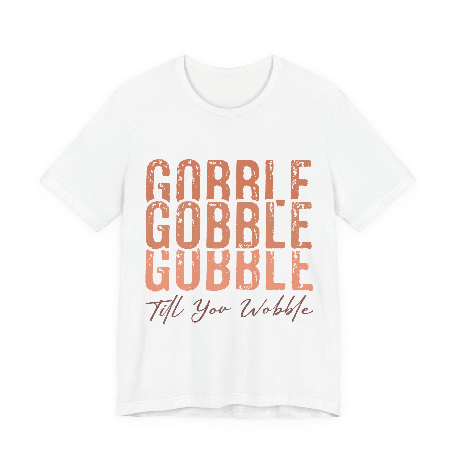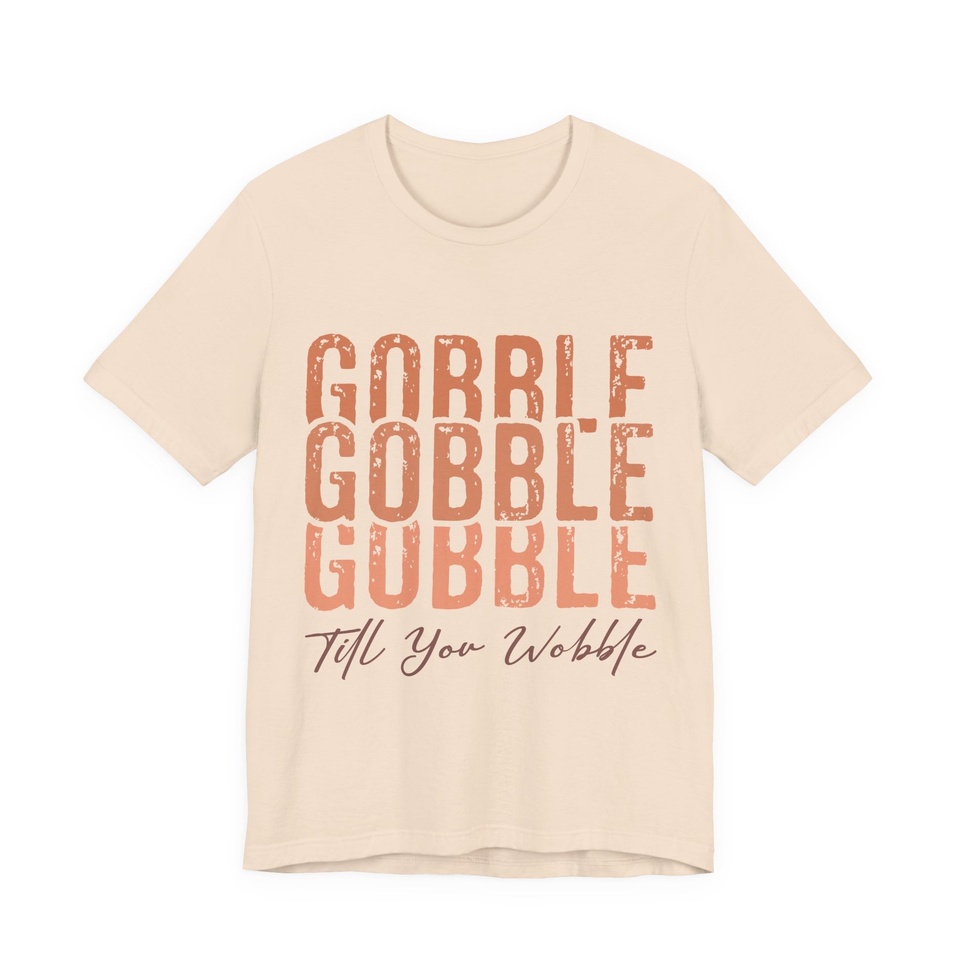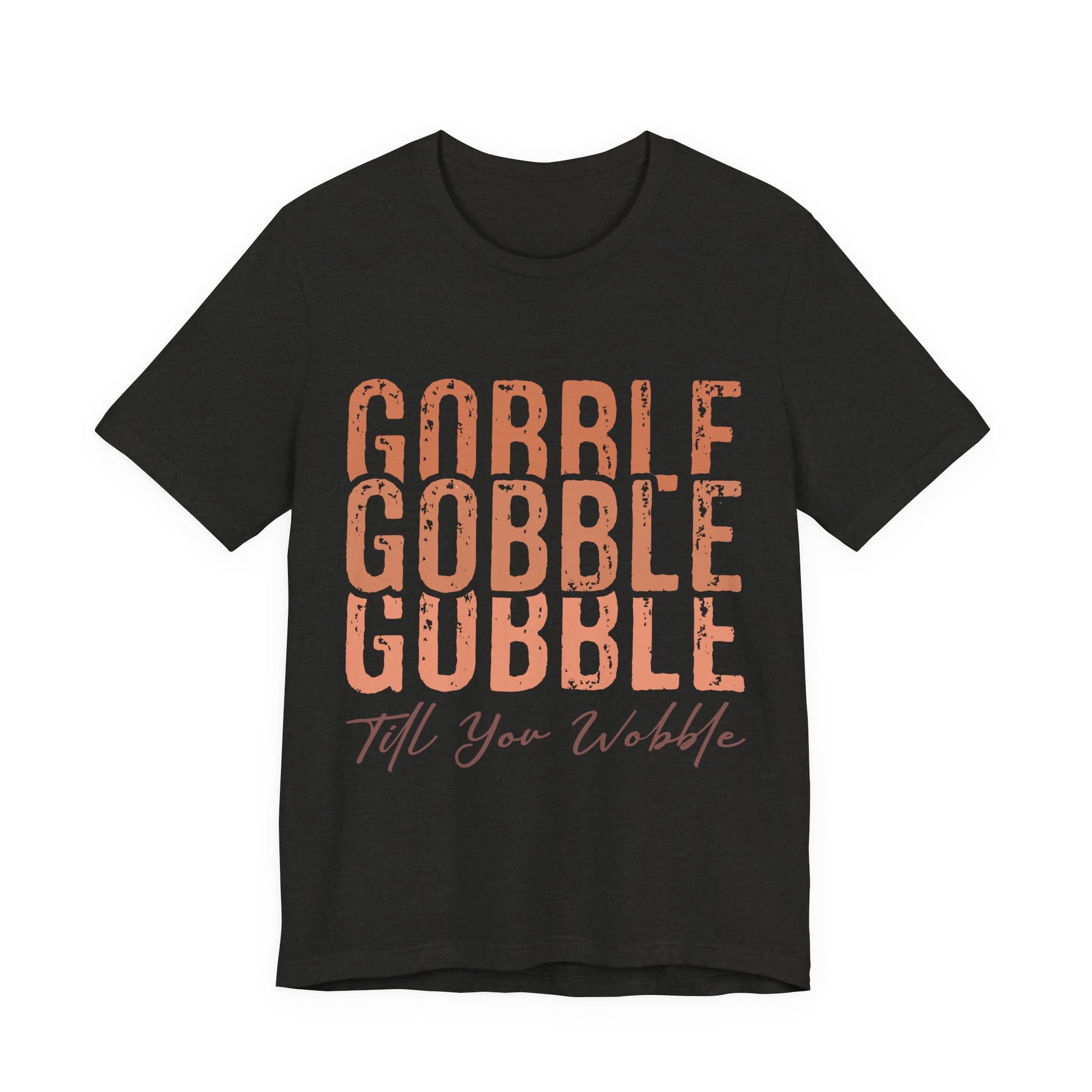 Lightweight, breathable cotton tee that brings a playful, cozy vibe to your Thanksgiving gatherings. The front features stacked, distressed lettering reading “GOBBLE GOBBLE GOBBLE” with a handwritten-style line below that says “Till You Wobble,” giving the shirt a warm, lived-in look. Wear it to dinner prep, family photos, or casual get-togethers — it layers easily under sweaters or pairs with jeans for a relaxed, festive outfit. Thoughtfully made from soft Airlume combed and ring-spun cotton with reinforced shoulder tape and side seams, it’s built to hold its shape while staying comfortable through long holiday meals and laughter-filled evenings.